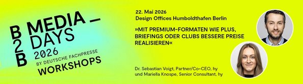 Europas größter B2B-Medien-Kongress: Die B2B Media Days by Deutsche Fachpresse sind das Highlight-Event der Fachmedienanbieter. Rund 300 Teilnehmerinnen und Teilnehmer kommen jährlich zusammen, um über aktuelle Trends und Entwicklungen und Business Cases zu diskutieren.